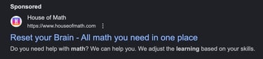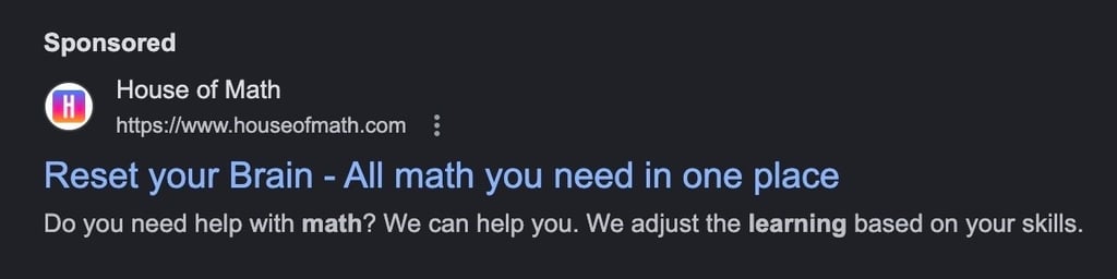 - Ketengahkan ciri-ciri penjualan unik (unique selling point atau USP). USP adalah point-point yang boleh membezakan produk anda berbanding produk pesaing. Di dalam bahasa yang paling mudah "apa yang membuatkan pelanggan memilih produk anda. Tapi, bukannya produk pesaing". Penekanan USP di dalam iklan boleh menjadi satu tarikan penting untuk audien klik iklan anda. Lihat contoh dibawah bagaimana House of Math mengetengahkan "learning based on your skills' sebagai USP penting dengan harapan audien akan tertarik untuk mendapatkan produk mereka.