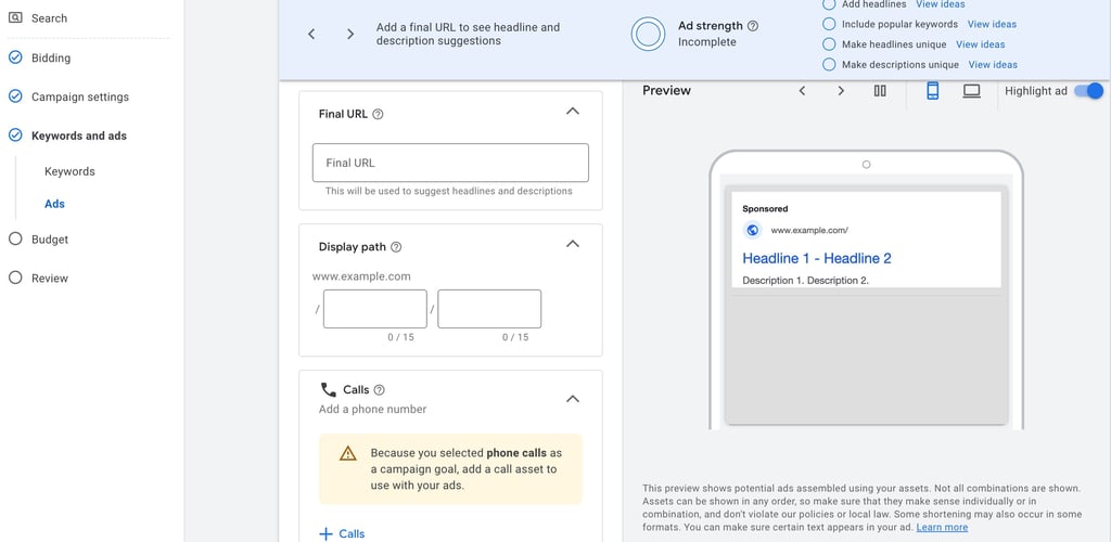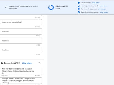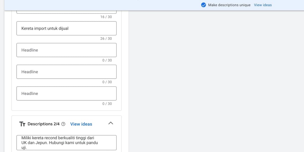 - Sediakan 10 atau lebih tajuk dan 3 atau lebih deskrispi iklan.