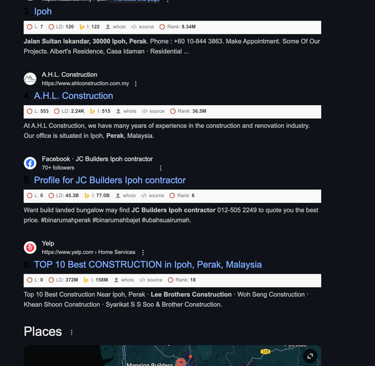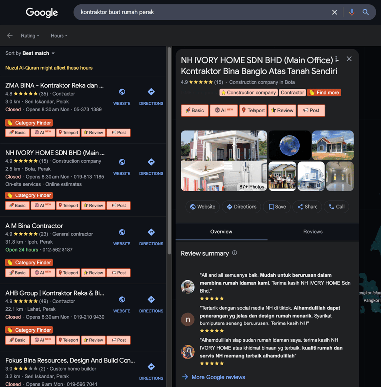 Ini merupakan paparan Google Business Profile bagi terma carian 'kontraktor buat rumah perak'. Untuk memastikan profil anda berada di rangking-rangking teratas dan berjaya dipilih oleh pelanggan (berbanding pesaing-pesaing anda), berikut adalah perkara-perkara yang perlu anda lakukan: