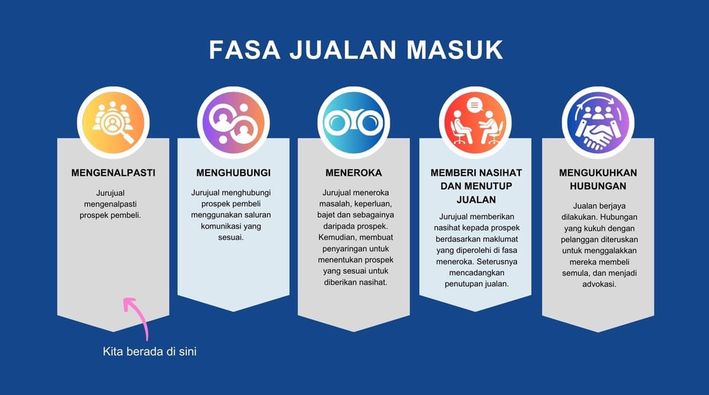 Di dalam artikel 'Apakah yang dimaksudkan dengan strategi pemasaran inbound', saya telah menerangkan tentang fasa-fasa yang terkandung di dalam strategi jualan masuk. Fasa-fasa tersebut terdiri daripada fasa mengenalpasti, fasa menghubungi, fasa meneroka, fasa memberi nasihat dan menutup jualan, hingga akhirnya ke fasa mengukuhkan hubungan.