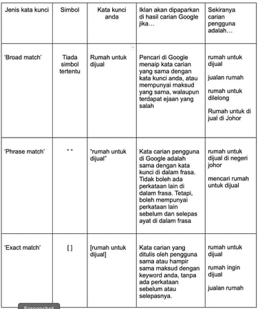 Kata Kunci Umum (Broad Match): Iklan akan dipaparkan di dalam carian Google sekiranya pengguna mencari maklumat menggunakan kata kunci yang ada persamaan dengan kata kunci umum yang anda gunakan. Ia termasuk kata kunci yang mempunyai maksud yang sama (synonyms), kata kunci di dalam bentuk singular dan plural, kesilapan ejaan, dan pelbagai variasi lain.