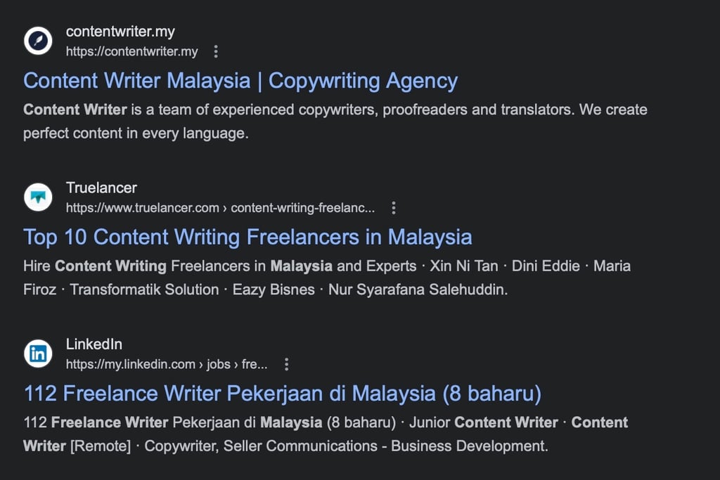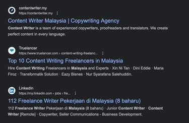 Gambar dibawah adalah contoh laman web yang dipaparkan melalui hasil carian pengguna di Google (SEO).