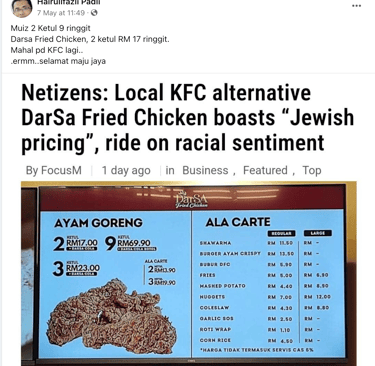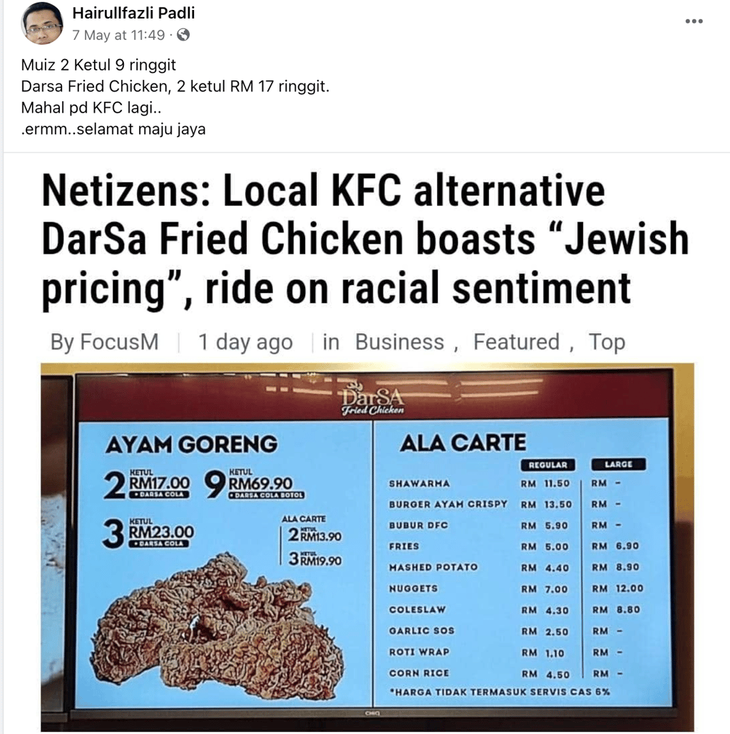 Darsa Fried Chicken menjadi mangsa kecaman netizen kerana harga yang ditawarkan tidak berdaya saing di pasaran.