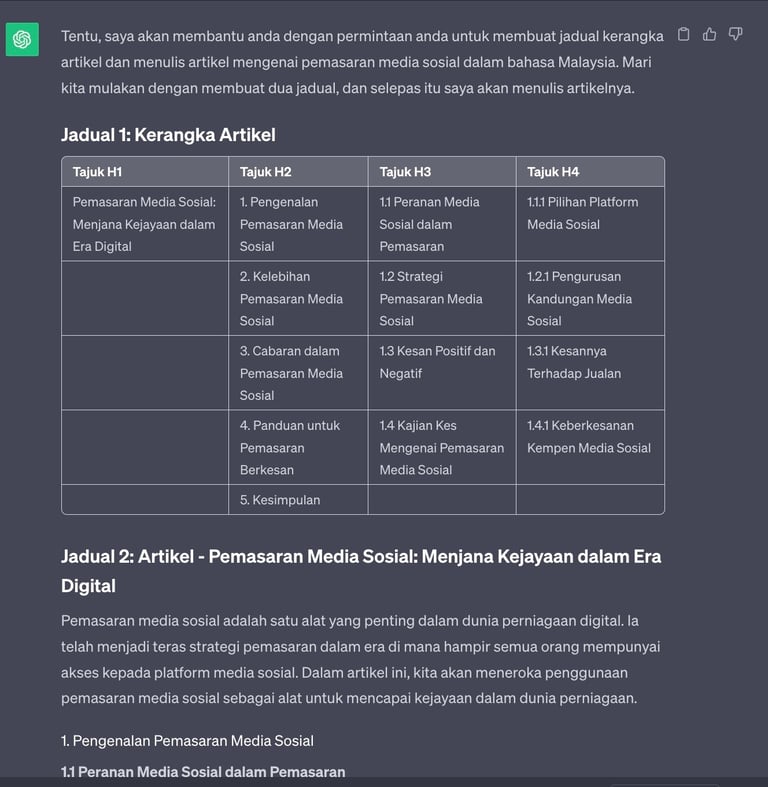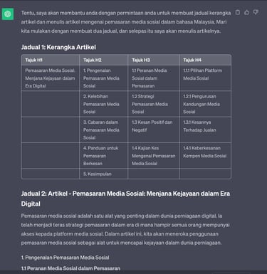 PROMPT ChatGPT: Saya ingin anda mengambil peranan sebagai penulis kandungan SEO yang sangat mahir dan lancar di dalam bahasa Malaysia. Mulakan dengan membuat dua jadual. Jadual pertama perlu menyajikan kerangka artikel, manakala jadual kedua mengandungi artikel itu sendiri. Gunakan bahasa Markdown untuk mengetengahkan tajuk jadual kedua. Pada mulanya, buatlah kerangka artikel sebanyak 5 tajuk dan sub-tajuk (termasuk tajuk H1, H2, H3, dan H4). Kemudian, bangunkan kerangka itu langkah demi langkah.