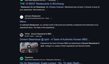 Ini merupakan keputusan yang dipaparkan oleh Google bagi terma carian 'steamboat restaurant near me'. Sekiranya anda peniaga restoran steamboat, anda perlu tahu strategi yang anda mesti lakukan supaya perniagaan anda berpeluang dipaparkan di muka surat teratas hasil carian pelanggan di Google.