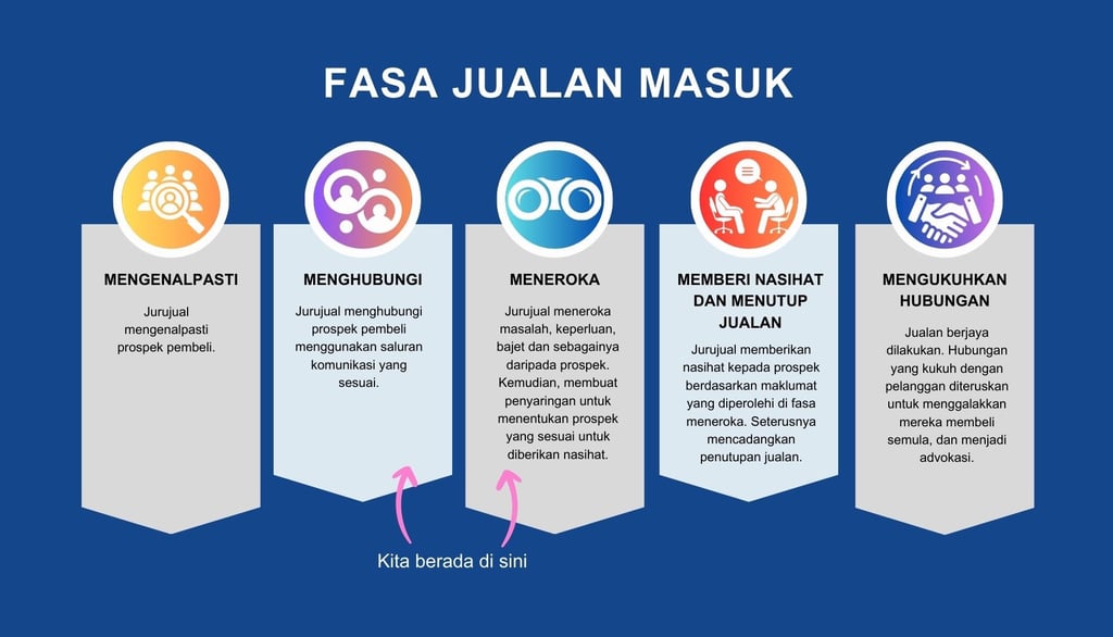 Artikel ini menyentuh fasa penting di dalam taktik jualan masuk atau pemasaran inbound iaitu fasa menghubungi dan fasa meneroka. Di dalam artikel ini, saya akan berkongsi panduan untuk menghubungi pelanggan, meneroka maklumat-maklumat penting daripada mereka, menyaring mereka dan akhirnya membuat keputusan samada prospek tersebut sesuai dengan perniagaan kita atau sebaliknya.