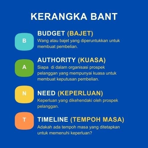 ✅ Kuasa: Seperti dalam BANT, anda perlu juga bertanya siapa di dalam organisasi prospek pelanggan yang mempunyai kuasa untuk membuat keputusan pembelian. Ini membantu anda mengenalpasti siapa yang perlu dihubungi dan dipengaruhi untuk menjalankan transaksi.